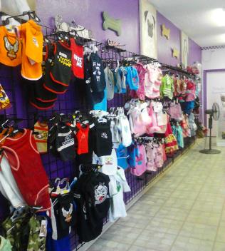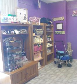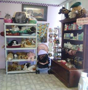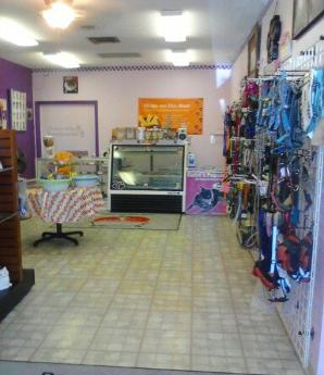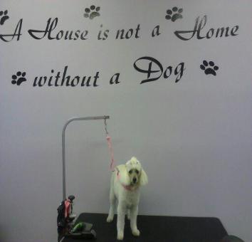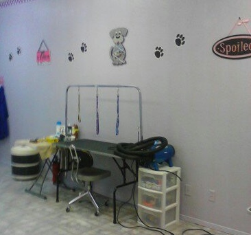 Our newly remodeled grooming area with 3 grooming stations 2 drying stations .